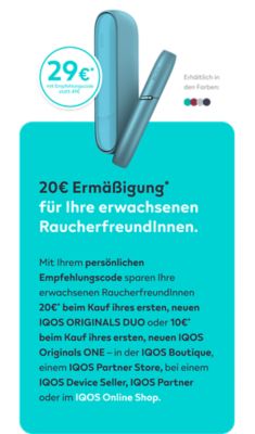 *Es gelten die Anwendungsbestimmungen zu Empfehlungen. Im Aktionszeitraum von 01.07 - 12.08.2024 können Ihre erwachsenen RaucherfreundInnen den 20€ Empfehlungscode auf ihr erstes, neues IQOS ORIGINALS DUO, oder den 10€ Empfehlungscode auf ihr erstes, neues IQOS ORIGINALS ONE im Online Shop, in der IQOS Boutique oder den IQOS Partner Stores einlösen. Ab Ende des Aktionszeitraums gilt 10€ für alle Geräte mit Empfehlungscode. Sie als Empfehlende/r erhalten auch nach dem 12.08.2024 einen 10€ Gutscheincode für unseren Online Shop jeweils nach erfolgreicher Empfehlung –  verwendbar für Einkäufe im Wert von zumindest 10€.