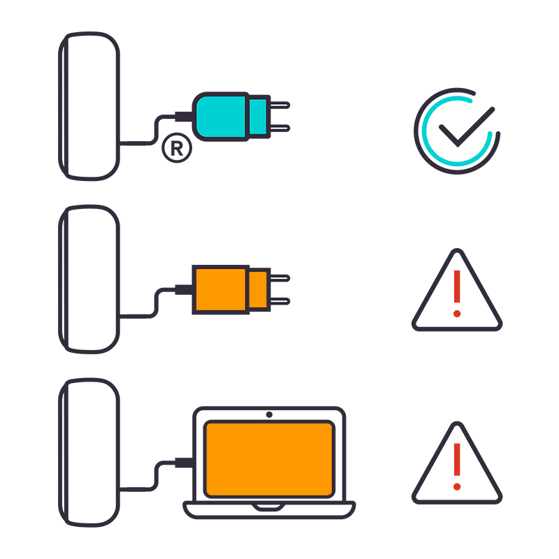 Убедитесь, что зарядные порты на ПК и зарядном кабеле чистые и не содержат загрязнений. В противном случае зарядка будет происходить медленнее, а время полной зарядки ПК увеличится. Для безопасного использования и оптимальной зарядки у вас есть три варианта (использовать адаптер переменного тока от предыдущих устройств IQOS, приобрести его отдельно в магазинах IQOS или на сайте iqos.com, использовать сертифицированный адаптер переменного тока стороннего производителя (с маркировкой безопасности).