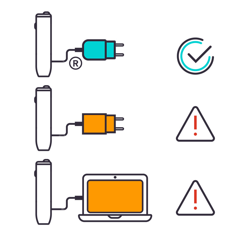 • Избегайте зарядки с помощью неоригинальных аксессуаров, так как зарядка может идти слишком медленно, устройство отключится, а красный индикатор будет мигать при кратковременном нажатии кнопки.