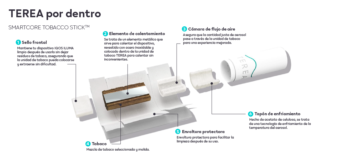 Dado que las unidades de tabaco TEREA cuentan con una parte de tabaco completamente sellada, no son compatibles con IQOS ORIGINALS ni con ningún dispositivo para calentar tabaco anterior. El uso de unidades de tabaco TEREA en un dispositivo con cuchilla de calentamiento puede dañar el dispositivo.