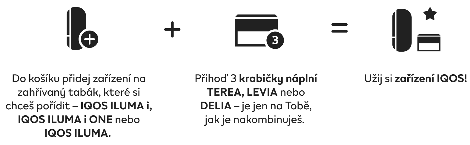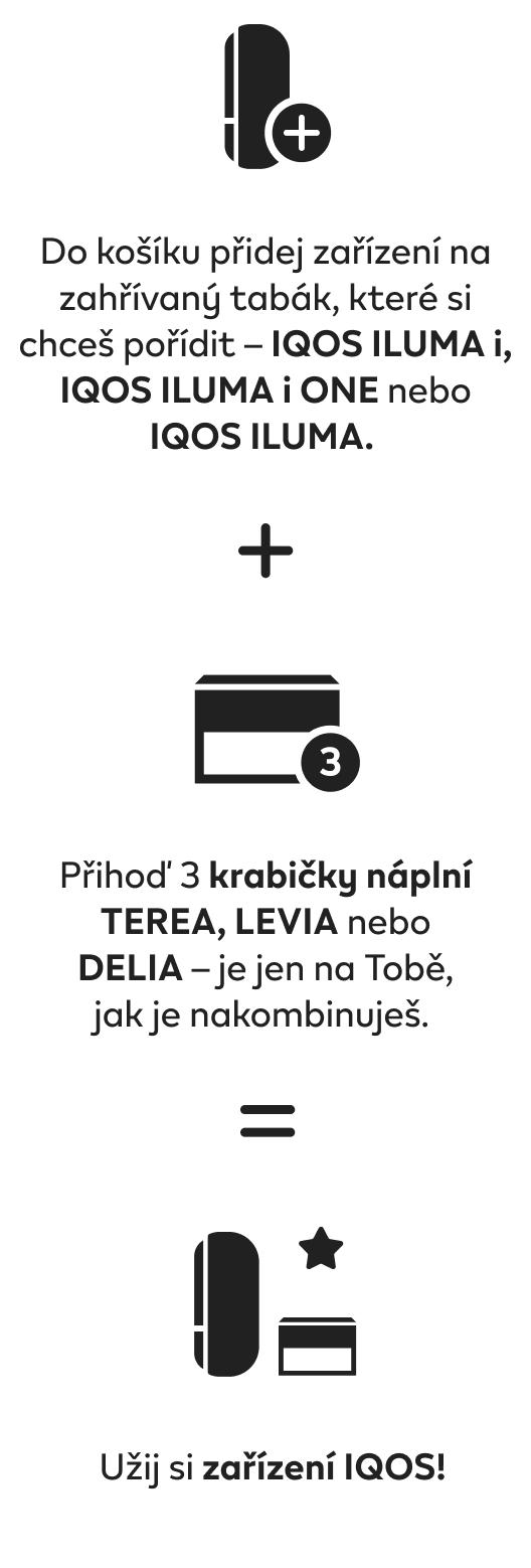 Nenech si ujít šanci pořídit si své první zařízení z řady IQOS ILUMA i za bezkonkurenční cenu. Nejdříve si vyber samotné zařízení – IQOS ILUMA i, IQOS ILUMA i ONE nebo IQOS ILUMA. Následně si vyber tři libovolné krabičky náplní TEREA, LEVIA nebo DELIA. Náplně si můžeš nakombinovat podle svých preferencí.