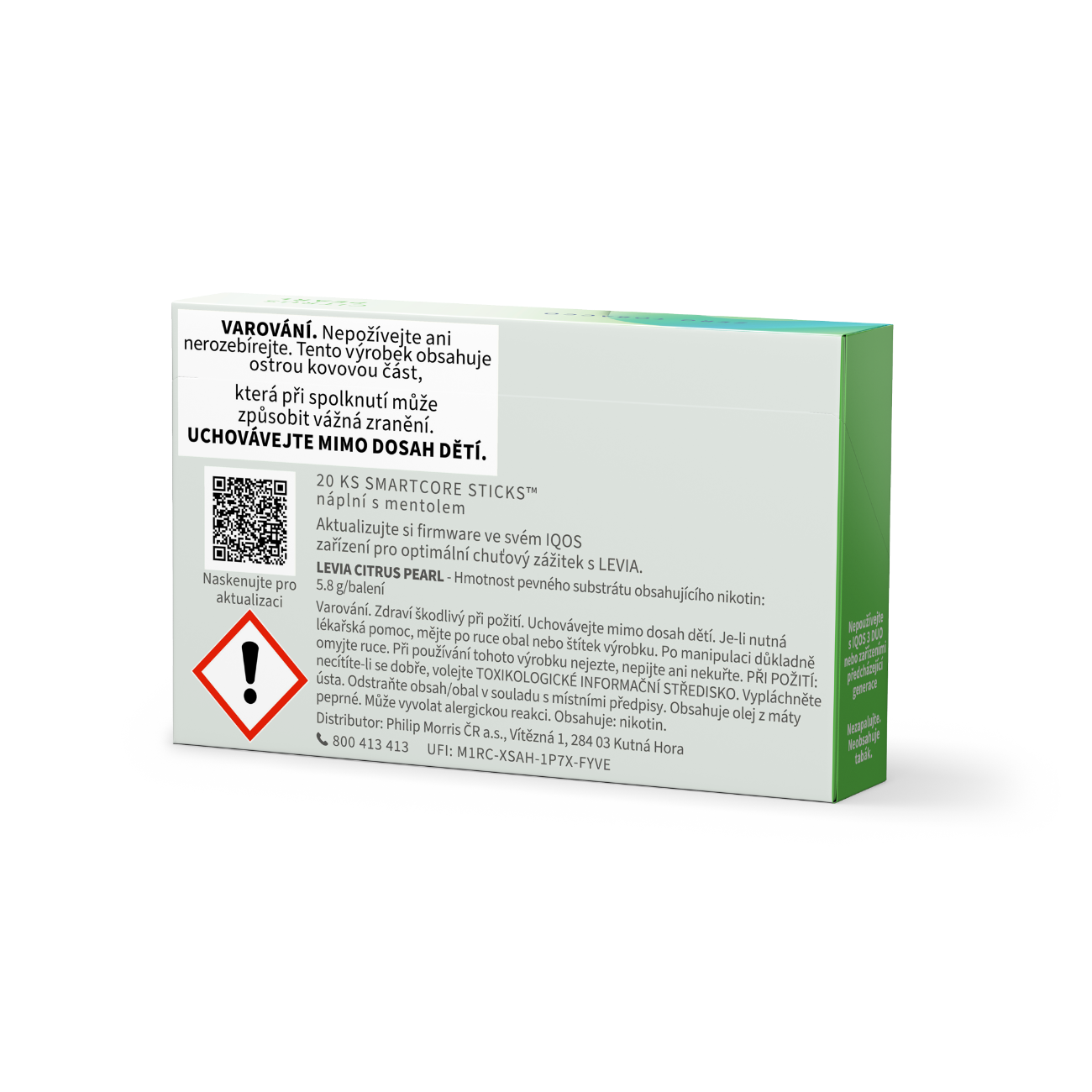 Varování. Zdraví škodlivý při požití. Uchovávejte mimo dosah dětí. Je-li nutná lékařská pomoc, mějtě po ruce obal nebo štítek výrobku. Po manipulaci důkladně omyjte ruce. Při používaní tohoto výrobku nejezte, nepijte ani nekuřte. PŘI POUŽITÍ: necítite-li se dobře, volejte TOXIKOLOGICKÉ INFORMAČNÍ STŘEDISKO. Vypláchněte ústa. Odstraňte obsah/obal v souladu s místnimi předpisy. Obsahuje olej z máty peprné. Může vyvolat alergickou reakci. Obsahuje: nikotin.