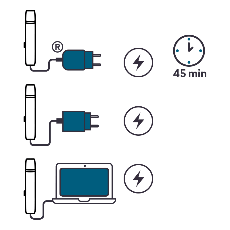 - Versichere Dich, dass Dein Device ausgeschaltet ist, indem du die Taste 3 Sekunden lang drückst, bevor du es reinigst.