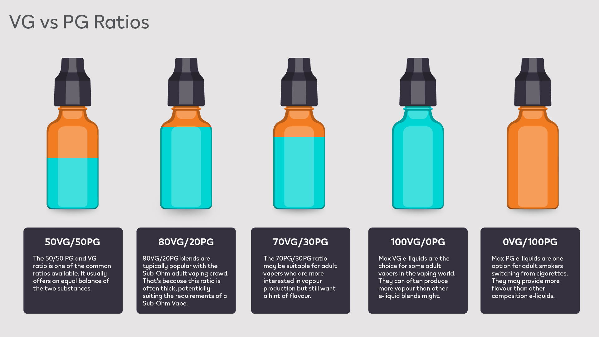 The balance of PG and VG comprise the basis of some e-liquids. The amount of each substance can vary, and this creates what is known as the ‘VG / PG ratio.’ This ratio partially determines a vaping experience, impacting elements like the taste.