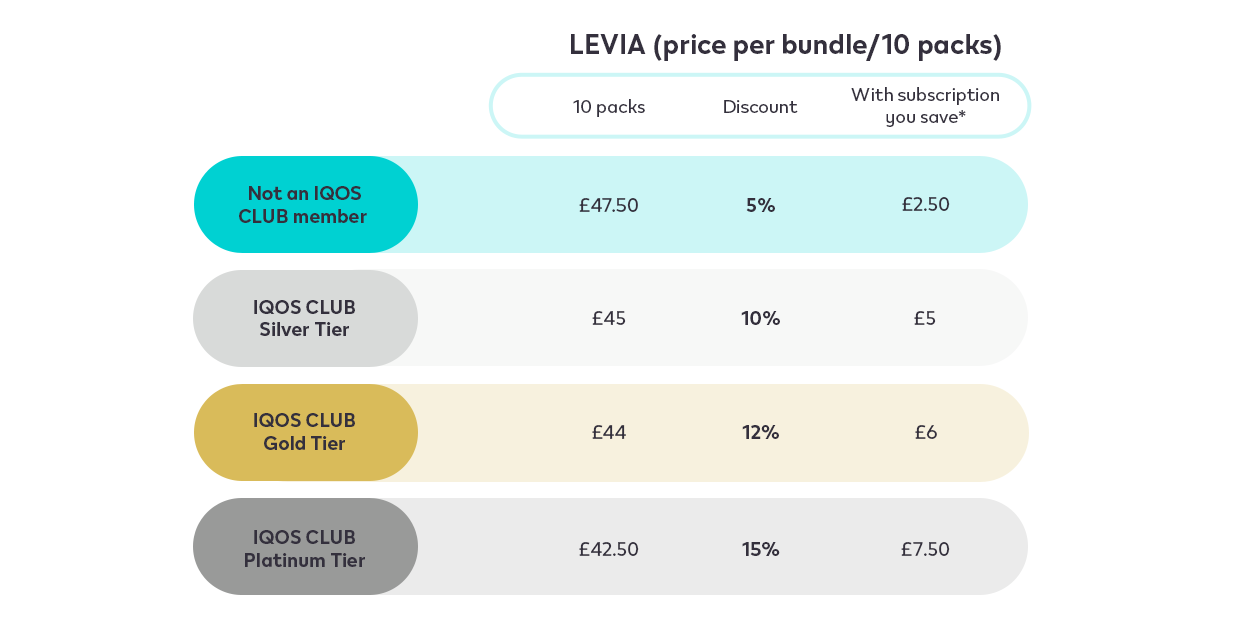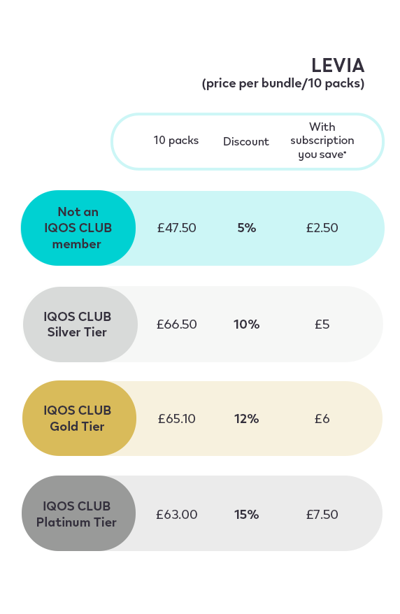 Unlock extra savings on your subscription orders as an IQOS CLUB member - 10% for Silver tier members and 15% for Platinum.