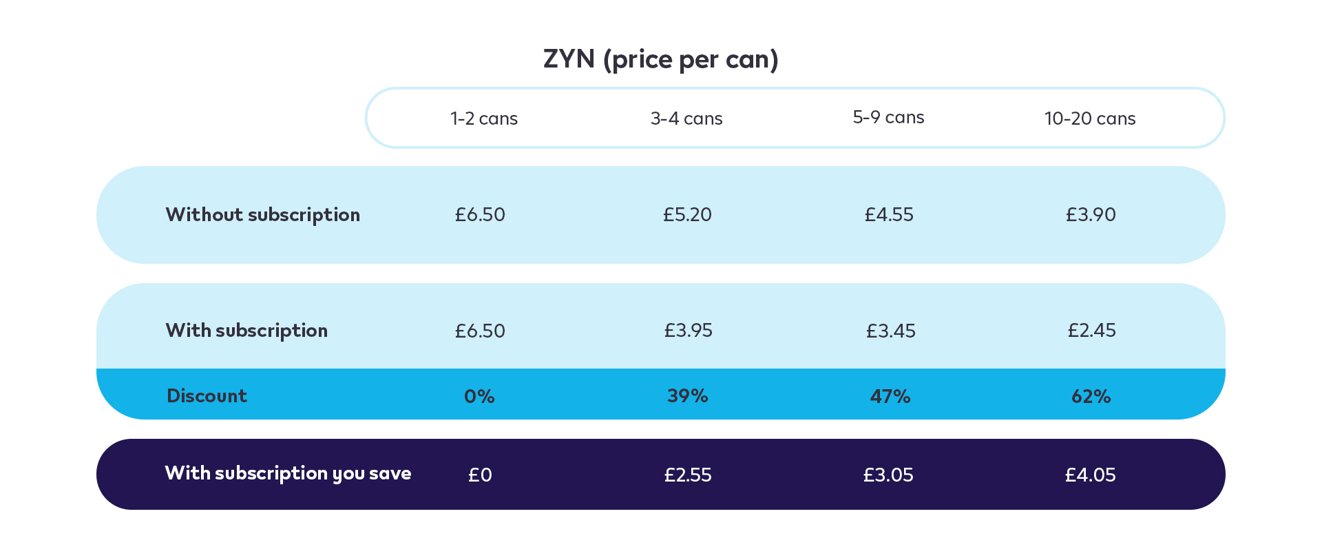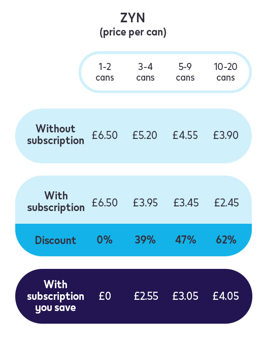 Save up to 62% when subscribing with ZYN. Discover how to save.