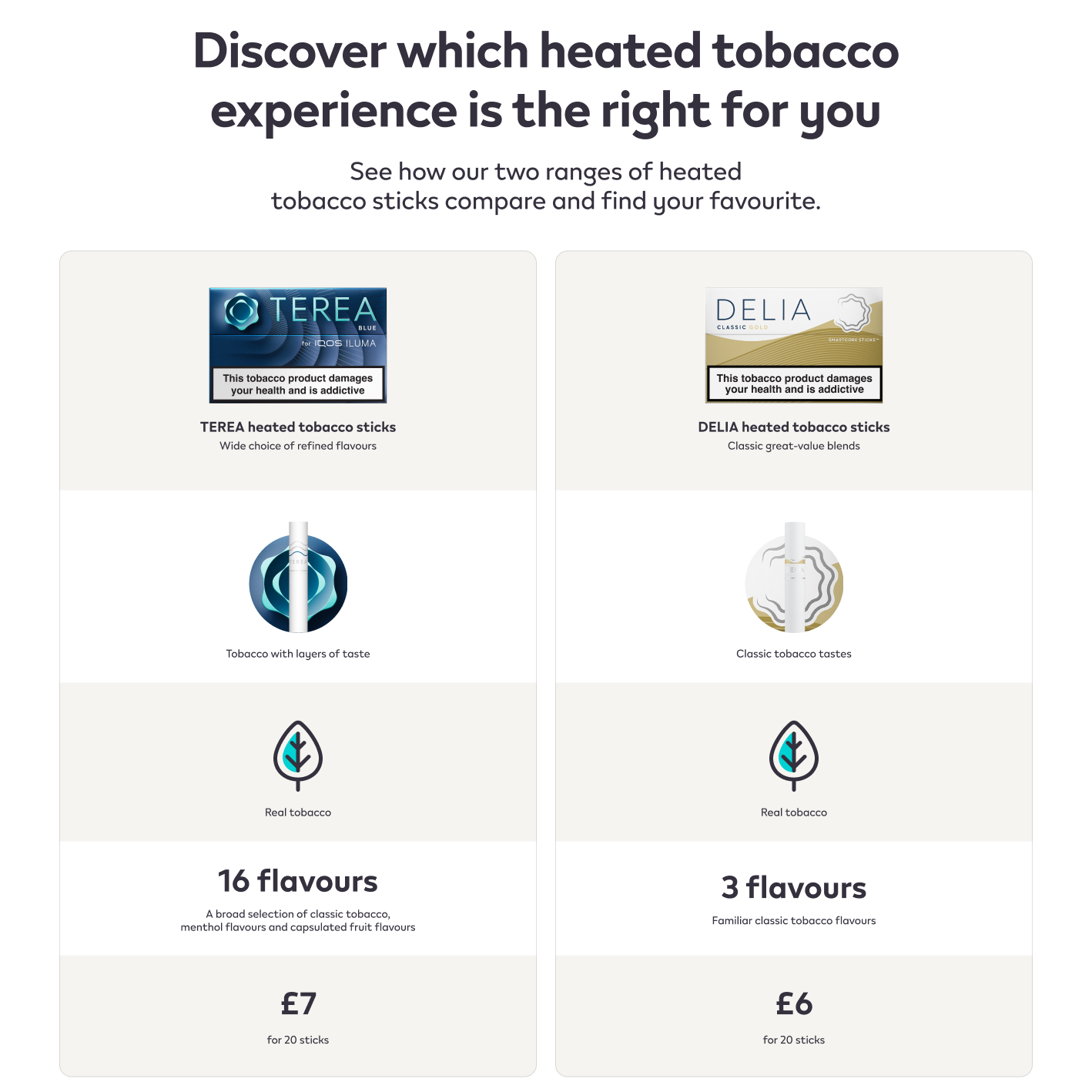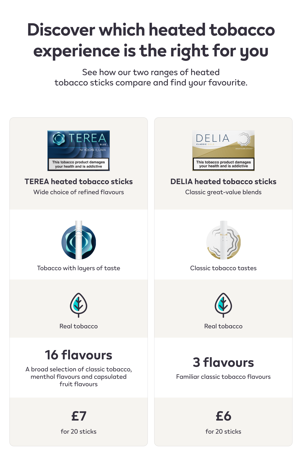 DELIA heated tobacco sticks are specially designed heated tobacco sticks intended for use with IQOS ILUMA heated devices. Do not ingest or disassemble DELIA sticks. This product contains a sharp metal part which can cause serious injury if swallowed. Keep out of reach of children. More information on our Important Information page.