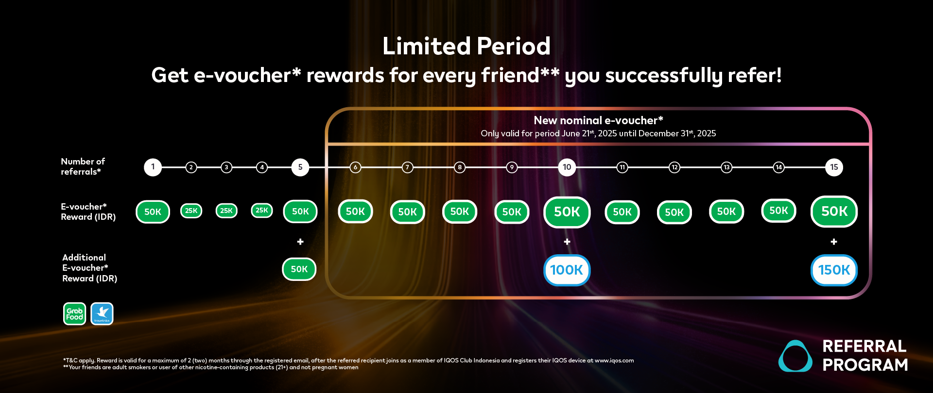 Simply refer your friends* to become IQOS Club Indonesia members. MGM Rewards are categorized based on the number of successful referrals: