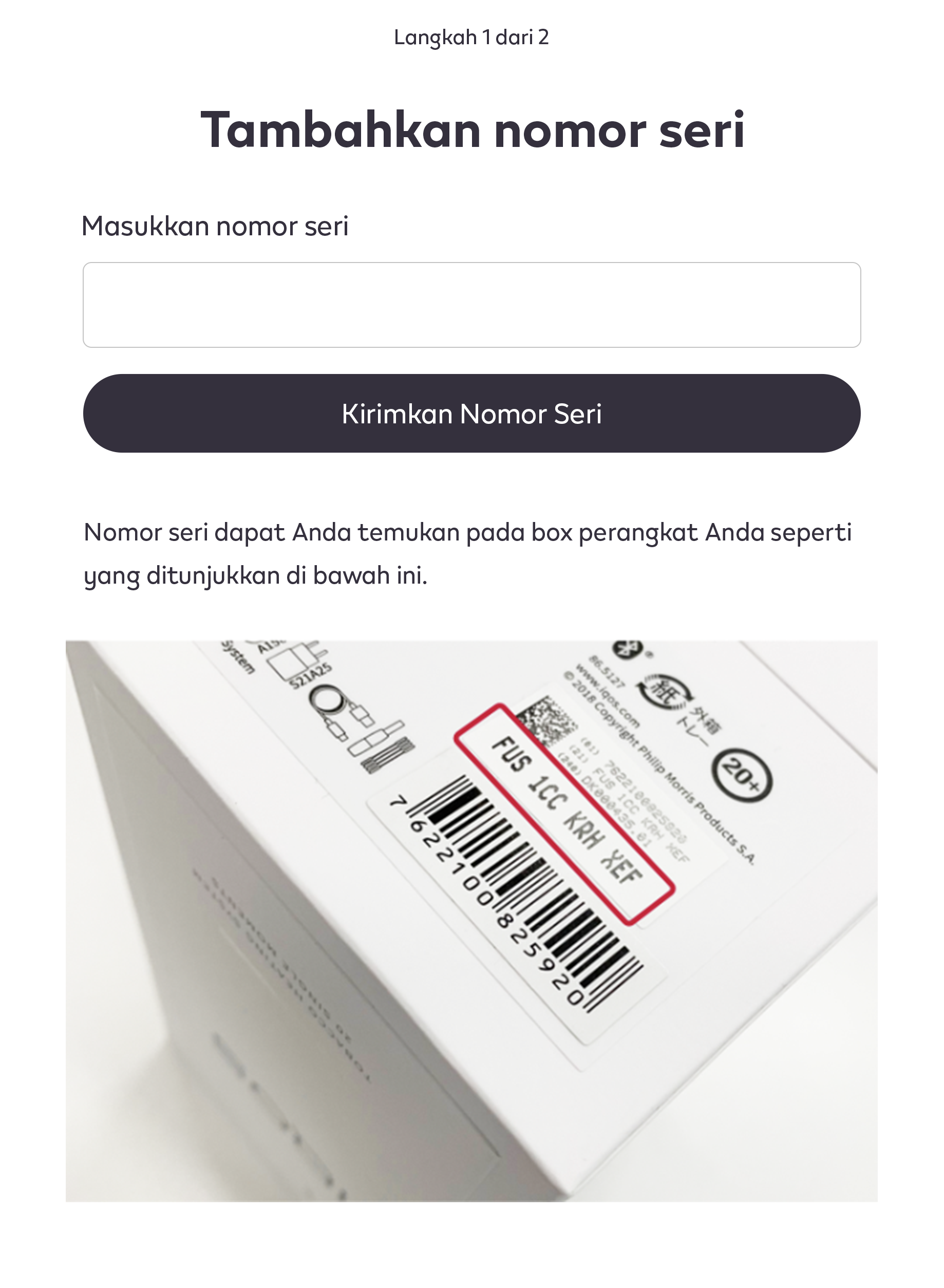 3. Klik ‘Tambah Perangkat’, lalu masukkan nomor seri perangkat Anda yang ada di box perangkat IQOS Anda.