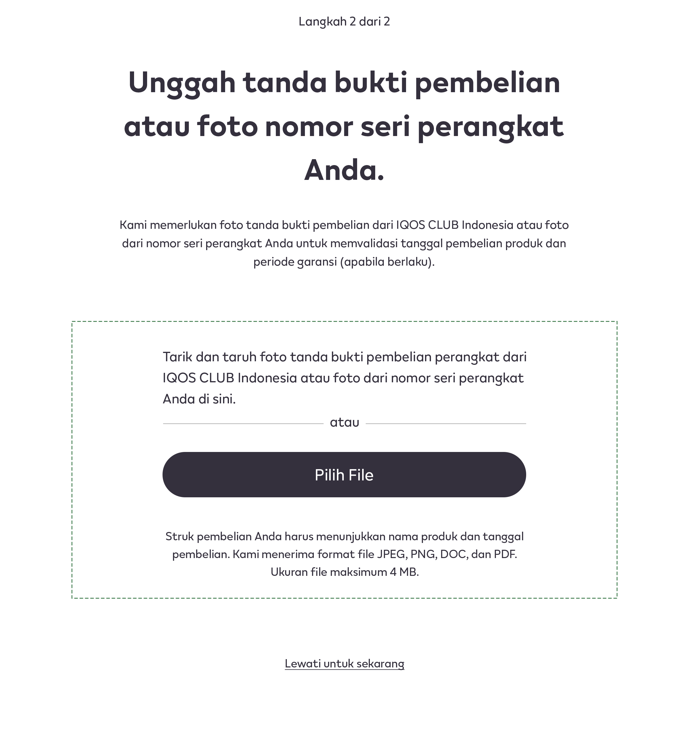 4. Upload bukti foto seri nomor perangkat Anda yang ada di box perangkat IQOS atau jika Anda masih menyimpan struk pembelian perangkat IQOS, Anda juga dapat mengunggah foto struk pembelian perangkat Anda. Struk pembelian juga akan dikirimkan melalui e-mail Anda yang terdaftar dengan akun IQOS Anda.