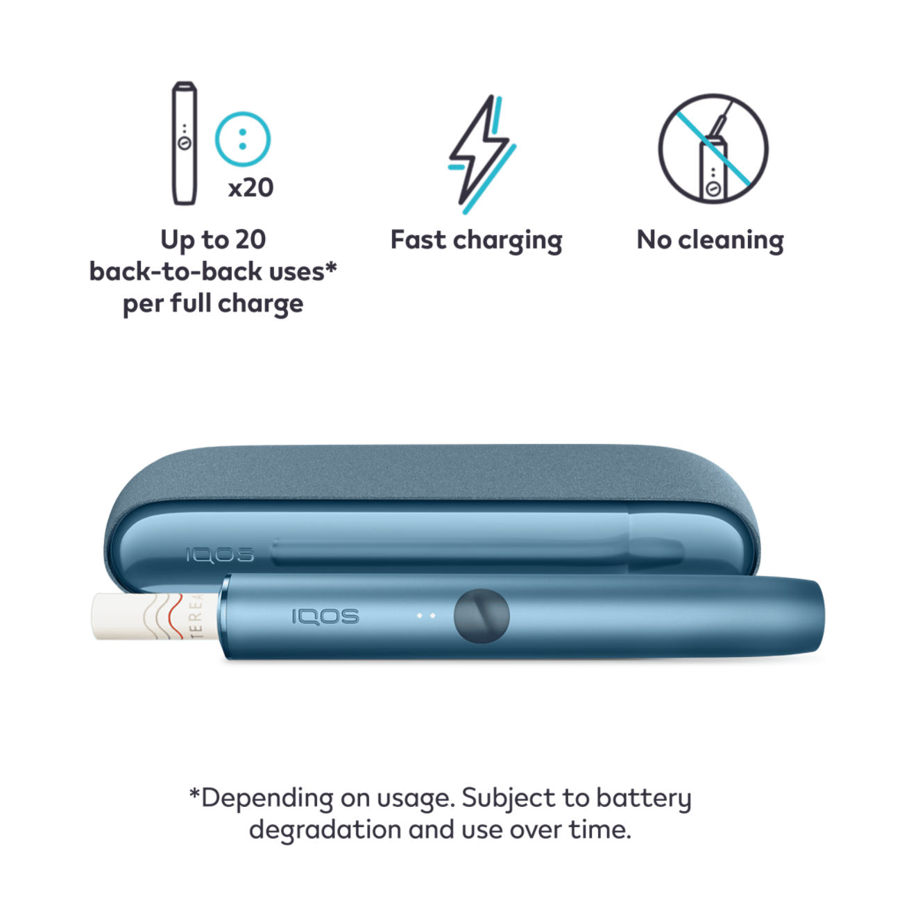 The elegant holder of the IQOS ILUMA has been specially developed for use with TEREA tobacco sticks. It has a fast charging function and allows you to enjoy two TEREA tobacco sticks directly one after the other. The battery of the Pocket Charger is enough for a total of about 20 tobacco sticks.
