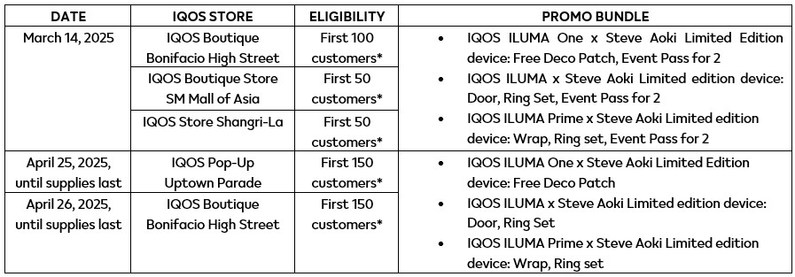 (b) Existing legal aged nicotine users who do not have a linked IQOS X Steve Aoki limited edition device may avail of Offer 2. In Offer 2, First 150 customers in IQOS Pop-Up Uptown Parade who will purchase an IQOS X STEVE AOKI Limited Edition device will get a free device accessory bundle. Specific to the Mar 14 execution (in BGC, Mall of Asia and Shangri-la) event pass for 2 to the Steve Aoki event will be given on top of the free accessory bundle for the first customers. Device accessory bundles are not for sale and are exclusive for promotion only. Free device accessory bundle will depend on the IQOS X Steve Aoki limited edition device that was purchased. Specific mechanics to avail of the offer are as follows: