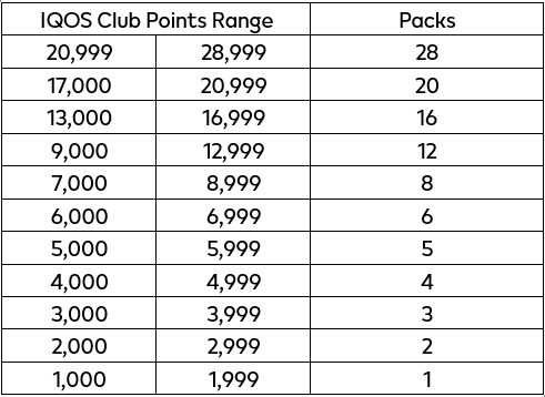 The applicable IQOS CLUB Status Points to TEREA Pack conversion shall follow the schedule below: