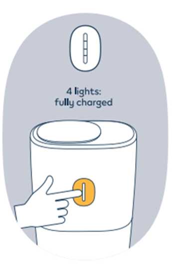 To check the charge level of the Pocket Charger, briefly press and release the Pocket Charger Button. The status light will turn ON for 3 seconds to indicate battery status where 4 LEDs indicates your Pocket Charger is more than 75% charged while 1 LED indicates the need to charge. Although, it doesn’t need a full charge to work, we recommend fully charging the Pocket Charger before your first use. |