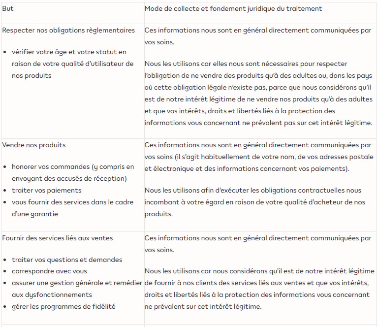 Nous faisons partie du groupe Philip Morris International. Nos coordonnées (dénomination, adresse, etc.) vous auront été communiquées séparément au moment de (ou afin de confirmer) la collecte d’informations vous concernant, par exemple dans le cadre d’une politique de confidentialité figurant sur une application, sur un site internet ou dans un courrier électronique et contenant un lien permettant d’accéder à la présente politique.