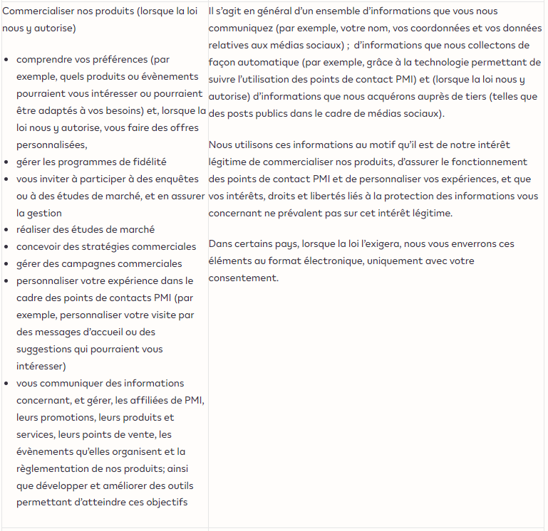 - Afin de commercialiser nos produits (lorsque la loi nous le permet), y compris de gérer nos programmes de fidélité, d’améliorer nos produits, d’effectuer des études de marché, de concevoir des stratégies commerciales, de gérer des campagnes commerciales et de personnaliser vos expériences sur les points de vente écoulant des produits PMI et lors d’évènements
