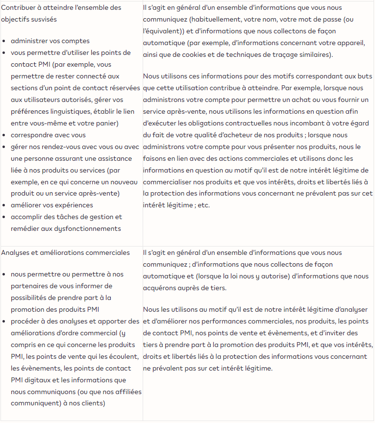 - Afin de contribuer à atteindre l’ensemble des finalités indiquées ci-dessus, y compris afin d’administrer vos comptes, de vous permettre d’utiliser les points de contact PMI, de correspondre avec vous, de gérer les rendez-vous que vous prenez avec nous ou avec une personne assurant une assistance liée à nos produits ou services (par exemple, en ce qui concerne un nouveau produit ou un service après-vente), de personnaliser vos expériences au niveau des points de contact PMI ainsi qu’à des fins d’administration, et de règlement des dysfonctionnements