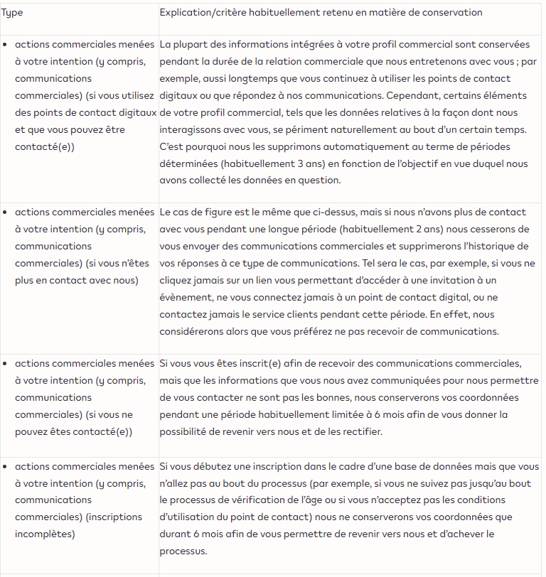 Nous conserverons les informations vous concernant durant la période nécessaire pour atteindre les objectifs en vue desquels elles auront été collectées. À l’issue de cette période, nous les supprimerons. Cette période variera en fonction des objectifs considérés. Veuillez noter que dans certaines circonstances vous êtes en droit de nous demander la suppression des informations en question. Nous sommes par ailleurs légalement tenus, dans certains cas, de conserver ces informations, par exemple à des fins fiscales et comptables.