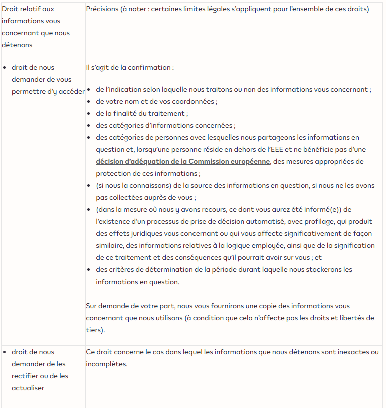 Les droits dont vous bénéficiez dépendent des lois en vigueur dans votre pays. Si vous résidez dans l’Espace économique européen, vous bénéficiez des droits indiqués dans le tableau ci-dessous. Si vous résidez en dehors de cet Espace, vous pouvez prendre contact avec nous (voir le paragraphe intitulé « à qui adresser vos questions ? » figurant à la fin de la présente politique) pour en savoir plus.