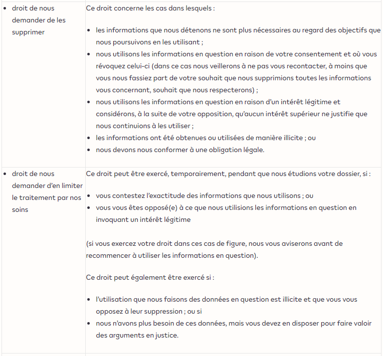 - le droit de vous opposer à ce que nous les utilisions, dans certaines circonstances ;