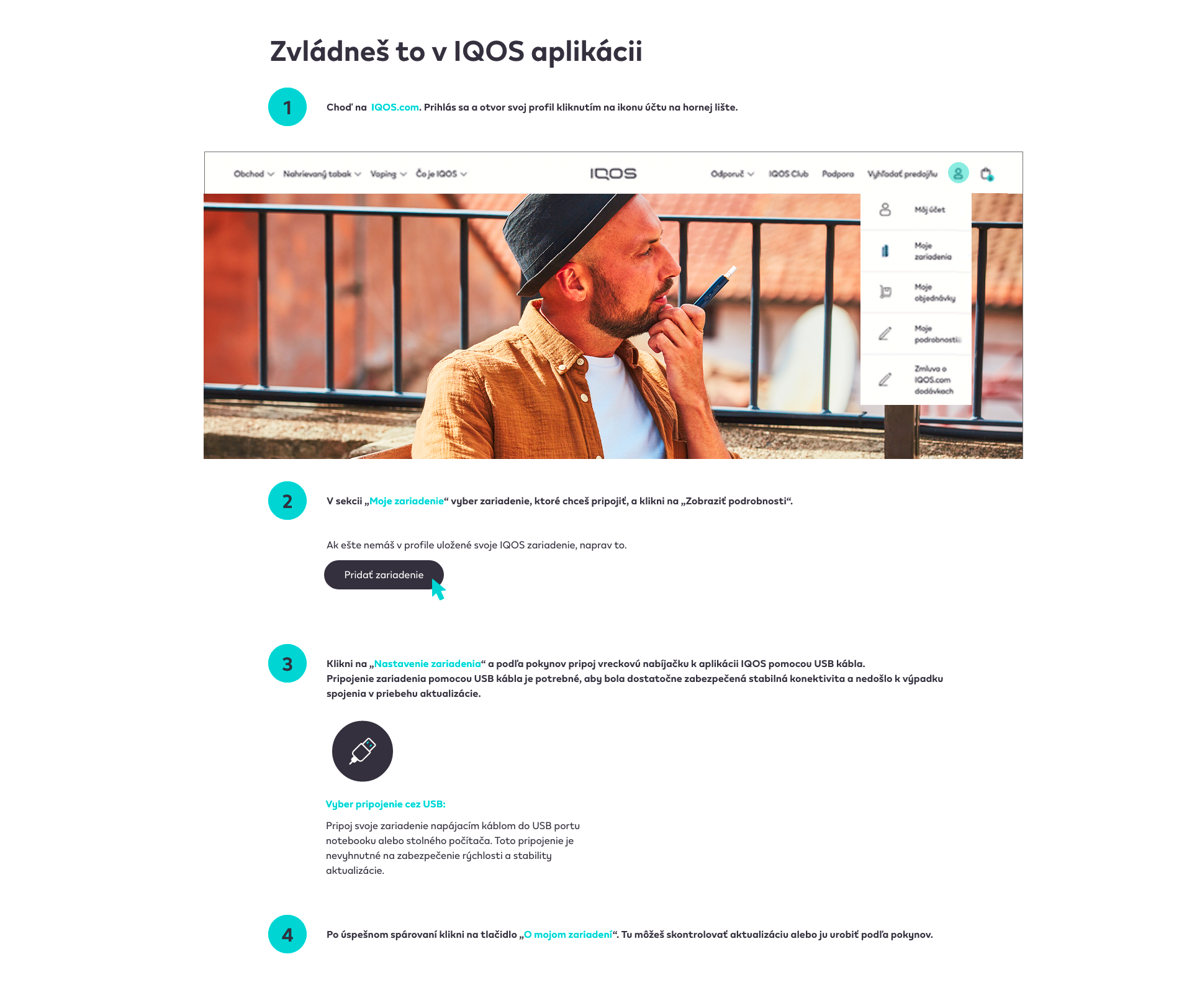 Skontroluj si ešte dnes, či je potrebná aktualizácia firmware na Tvojom zariadení. Môžeš sa spojiť s Centrom zákazníckej starostlivosti, navštíviť našu IQOS predajňu alebo aktualizovať firmware v aplikácii z pohodlia svojho domova. V každom prípade Ti to zaberie len niekoľko minút, zlepšíš tým výkon zariadenia a predĺžiš jeho životnosť. Aktualizácia je odporúčaná raz za tri mesiace.